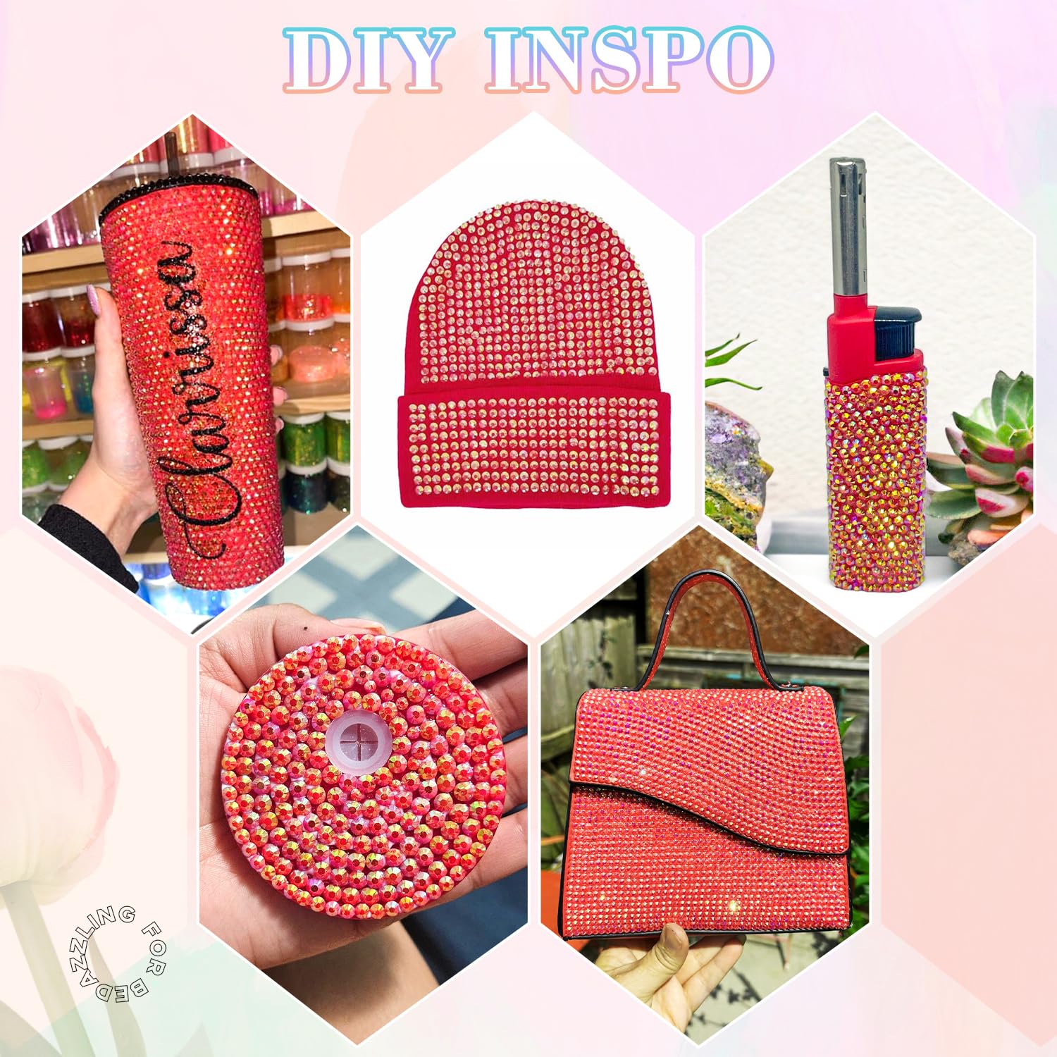- PACKAGE CONTENT – This all-in-one bedazzler kit includes everything you need to start creating dazzling designs: 1 box of Red AB rhinestones with 24 grids (approx. 30,000 pcs of bedazzling rhinestones assorted size SS6/10/16/20/30 ), 1 precision tweezers, 1 pickup pen for handling small gems, and 3 tubes of B7000 jewelry glue for secure application.