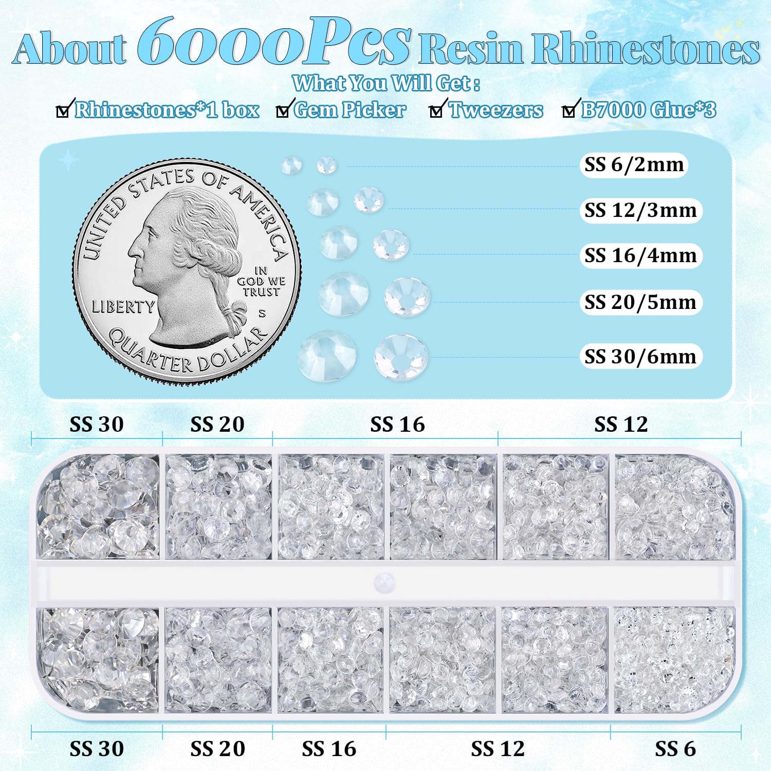 6000Pcs Resin Rhinestones for Bedazzling with 3Pcs B7000 Jewelry Glue, 1 Box Transparent Flatback Rhinestones for Crafting Crafts DIY, Crystals Gems for Clothing Shoes Tumblers Nail Art Makeup