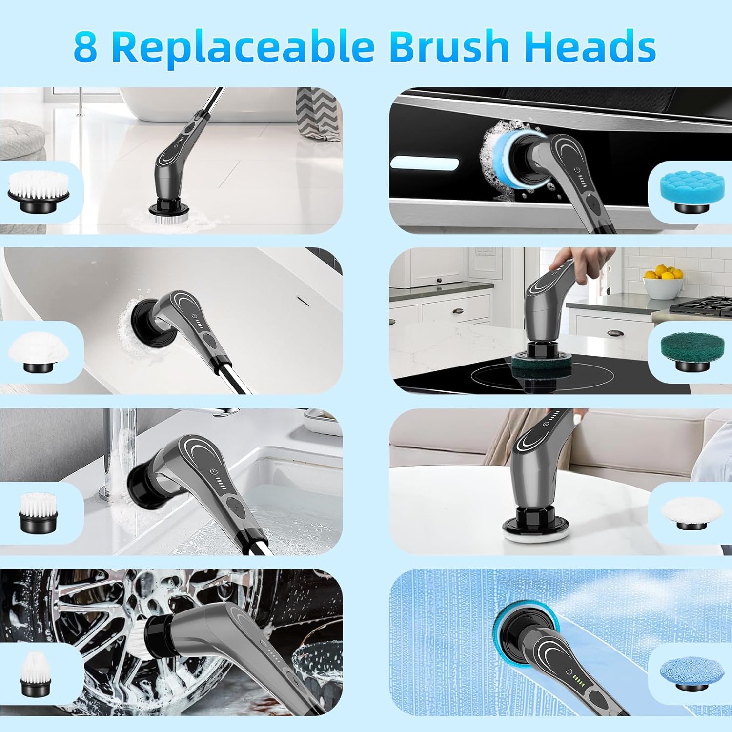 - 【8 Replaceable Brush Heads】: YANRAN electric spin scrubber has equipped with 8 cleaning heads. All the brushes can meet most of your requirements.this electric scrubber can be used to clean a wide range of surfaces in your home.For example, cleaning shower rooms, cleaning narrow and hard to reach areas, bathtub, glass, tile wall, car surface, kitchens,wheel hub, car seat, furniture and windows and so on.