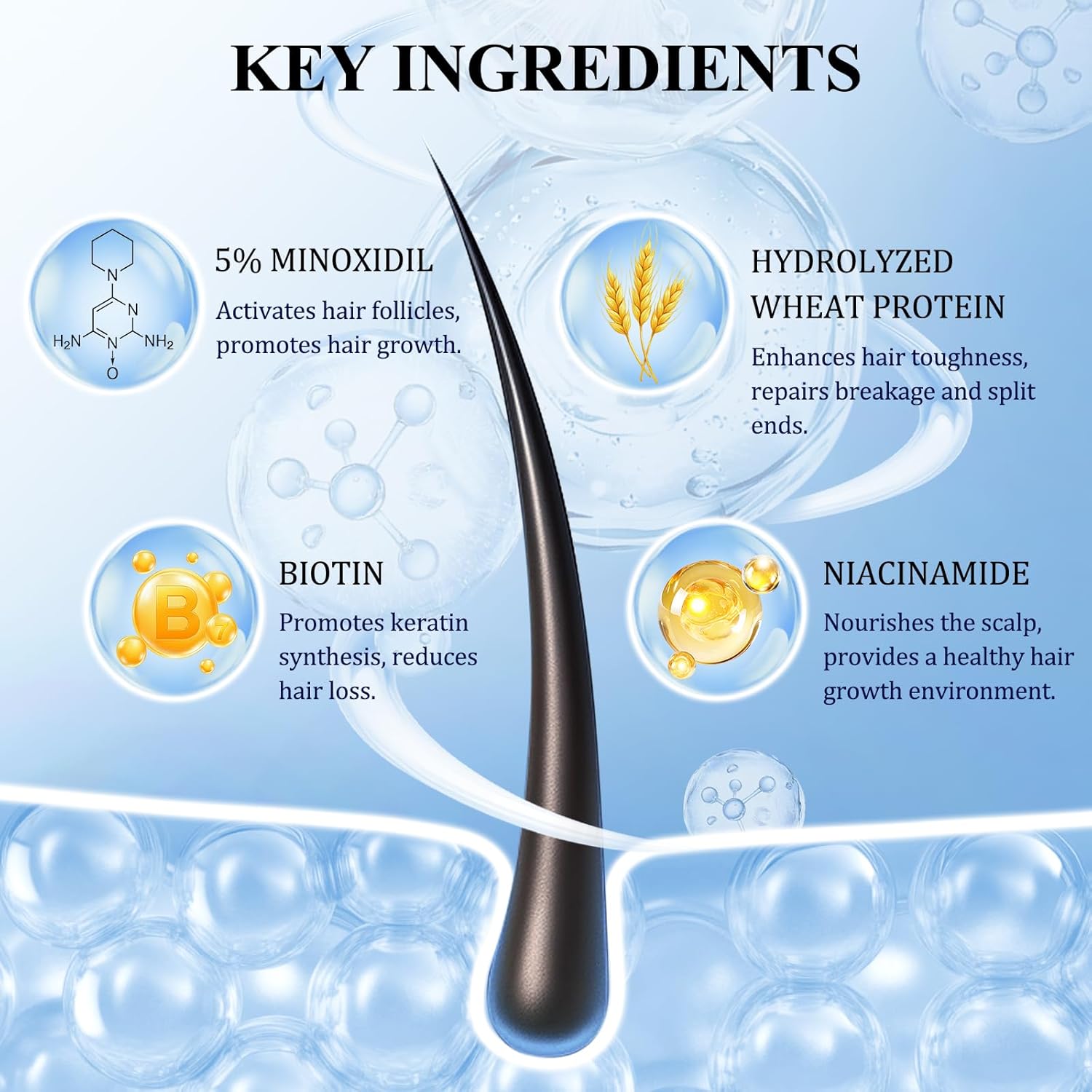- Carefully Matched: Hair growth spray contains 5% minoxidil, combined with hydrolyzed wheat protein, biotin, which can nourish the scalp, repair hair breakage and split ends, effectively reduce hair loss, and help grow stronger, thicker and fuller hair.