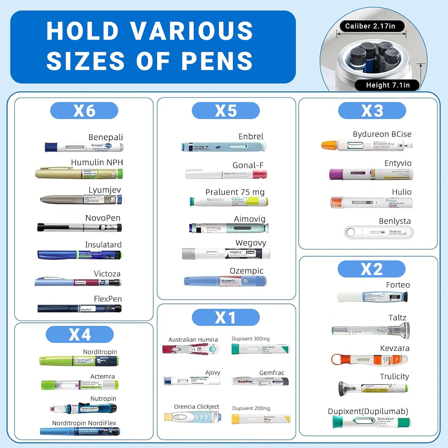 - Large Capacity, Compact & Lightweight: The GANENCSNC Diabetic Travel Case offers ample storage space, accommodating 6 insulin pens or 20 refill cartridges. With dimensions of just 5.5 x 5.5 x 25 cm (2.17 x 2.17 x 9.84 inches) and a weight of only 0.66 kg (1.46 lbs), it can be easily carried with one hand. Includes a portable insulated backpack and a charging cable for worry-free travel.