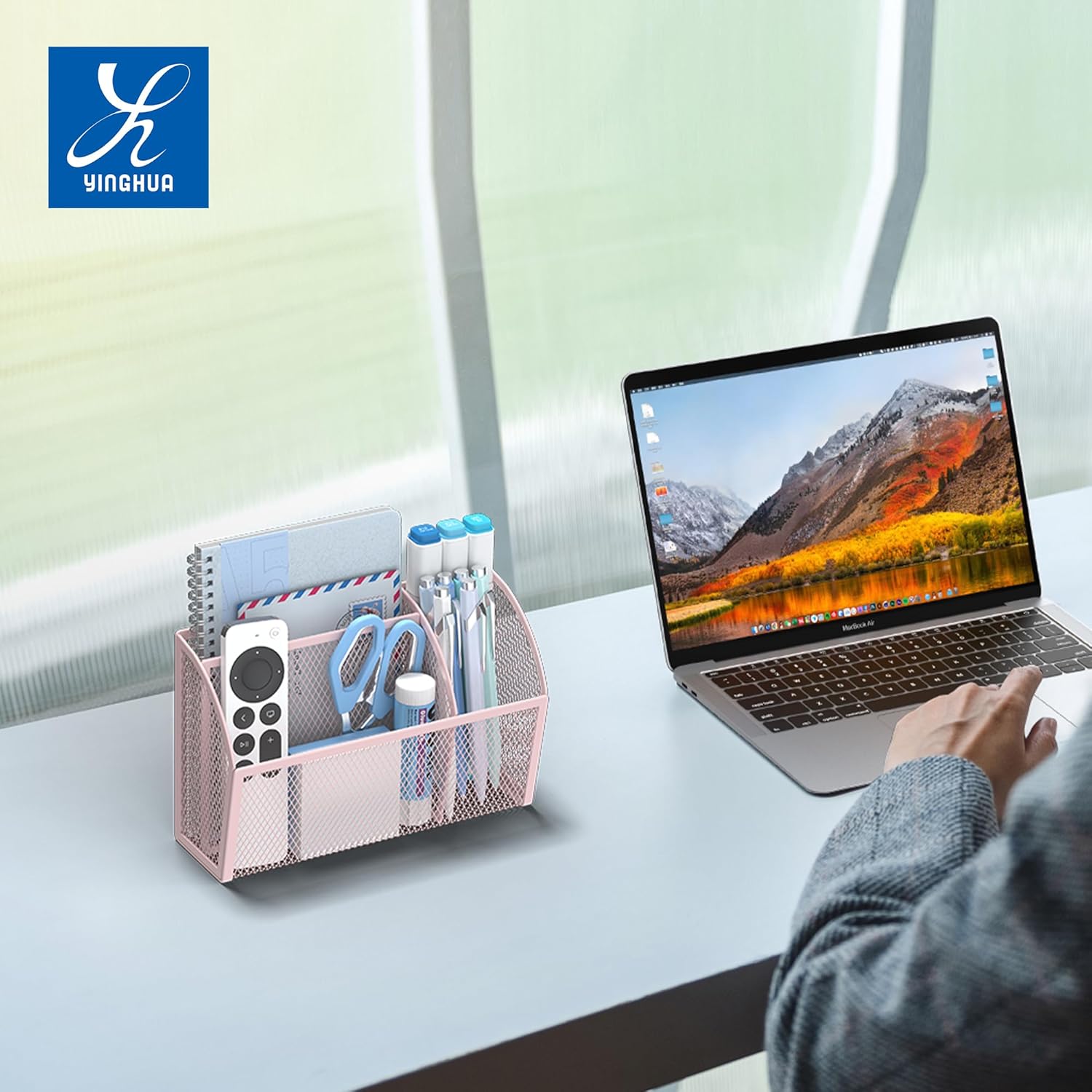 - Smart 3-Compartment Design for Better Organization – Featuring three neatly divided sections, this sleek pink pen organizer for desk keeps pens, clips, sticky notes, and desk supplies neatly sorted. The open mesh design allows easy visibility and quick access, making it an ideal desk organizer caddy for a clutter-free workspace, home, or school
