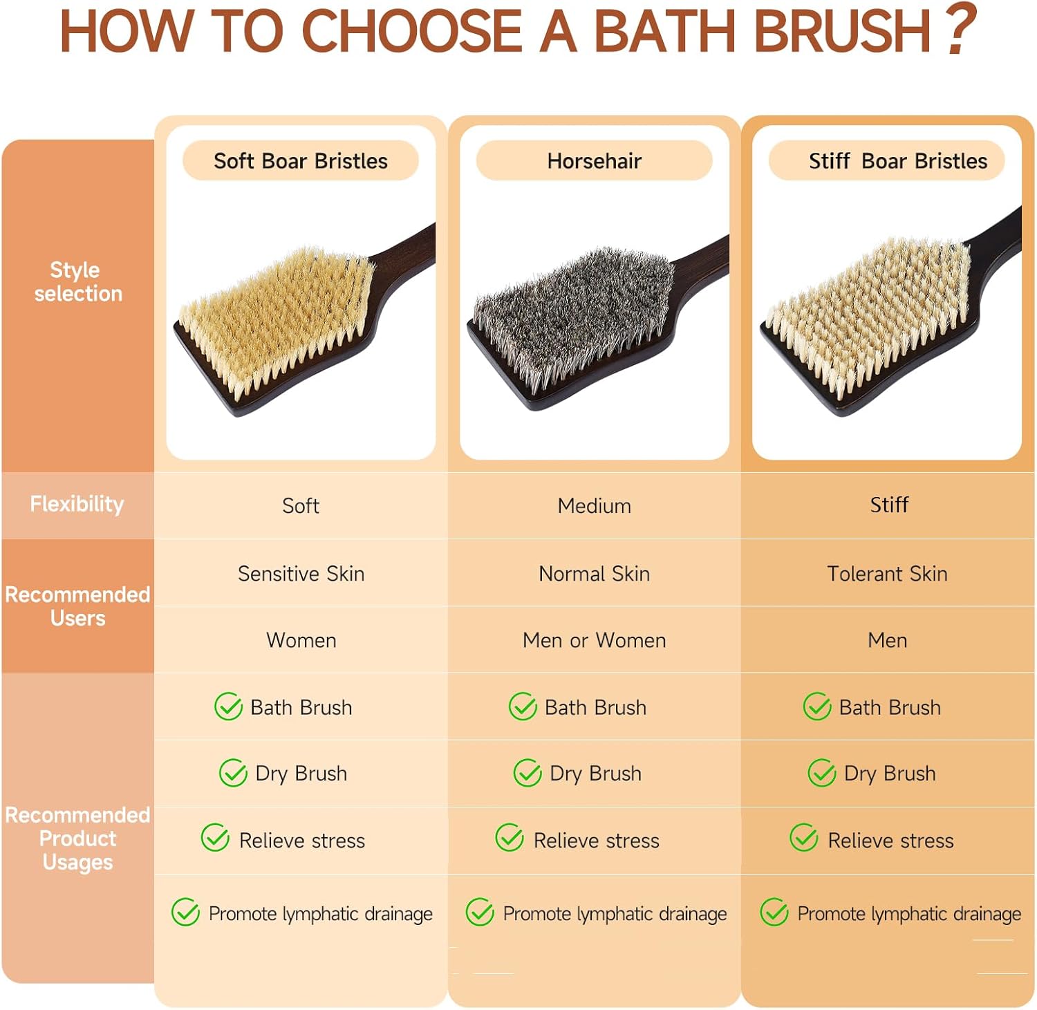 - Bristle Selection & Adaptability: When used for dry brushing, it unclogs pores, boosts blood circulation, alleviates stress, and keeps skin feeling refreshed daily. In the shower, it delivers deeper exfoliation. Ideal for dry, rough skin and other skin concerns.