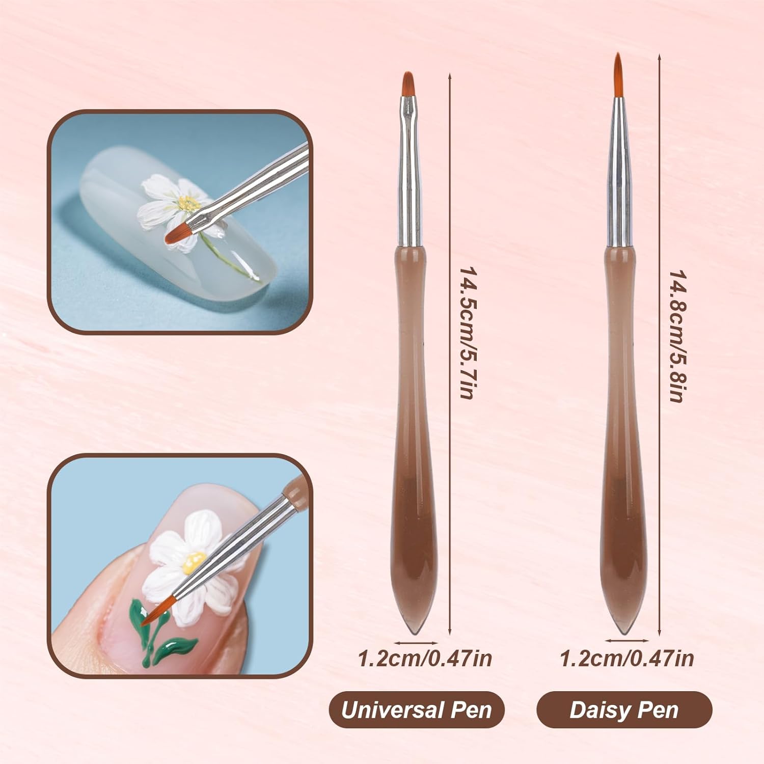 - Package Includes: You will receive 2 professional nail design brushes, perfect for detailed work such as creating flowers, leaves, petals, and other intricate designs.