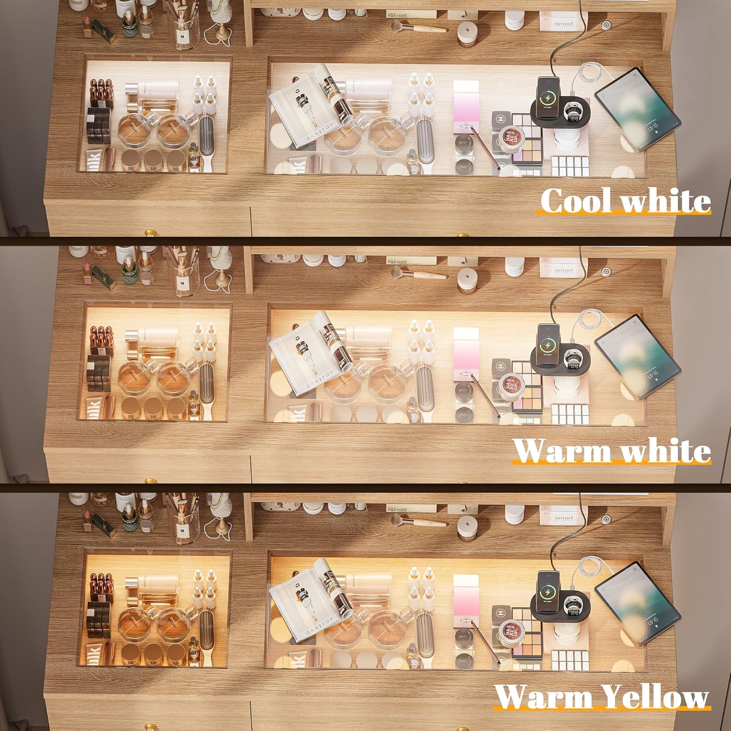 - 【Glass Top Vanity with RGB Drawers】white vanity desk is designed with a transparent tempered glass tabletop, you can easily see everything inside the vanity drawers. The built-in LED lights feature three color temperature modes, adding a touch of brightness and style to any room.